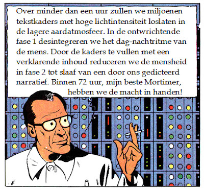 Toch vind ik het een hardnekkig misverstand, de voortzetting van deze heldenreeks waarin zo strak (lees: bekrompen) binnen oudmodische lijntjes moet gekleurd - zelfs als de uitgever er een krankzinnig bedrag voor beurt. De tijd staat stil, vernieuwing is ongeoorloofd. Mortimers voetje dat buiten het kader steekt (zie boven), is een frivoliteit die Van Dongen, weten we inmiddels, moest aanpassen.